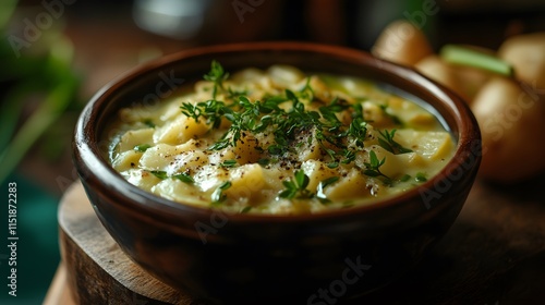 Creamy Potato Soup with Fresh Herbs and Garnish in Rustic Bowl