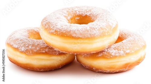 Creamy, powdered donuts stacked enticingly against a clean white background, perfect for use in food blogs, dessert menus, or promotional materials for bakeries and cafés,