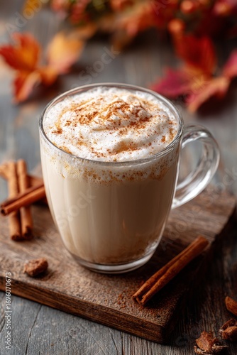 Creamy pumpkin spice latte with whipped cream and cinnamon on wooden board. Pumpkin chai tea latte in a clear glass mug with cinnamon stick and nutmeg dusting, concept of autumn warm drinks