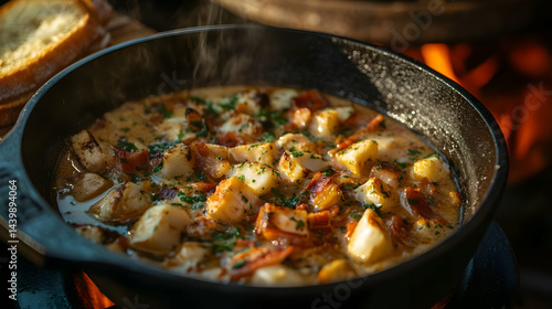 Creamy Scallops and Potatoes with Bacon in Cast Iron Skillet
