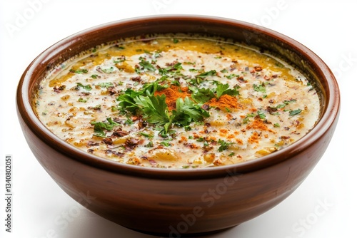 Creamy soup in a rustic bowl garnished with fresh parsley and vibrant spices on a white backdrop food photography