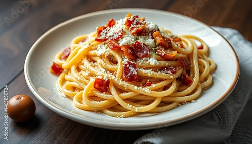 Creamy Spaghetti Carbonara with Crispy Bacon on Rustic Wooden Table