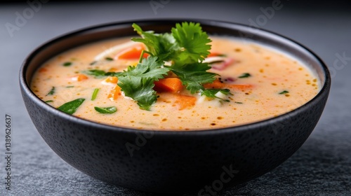 Creamy, spiced soup in a dark bowl, garnished with cilantro