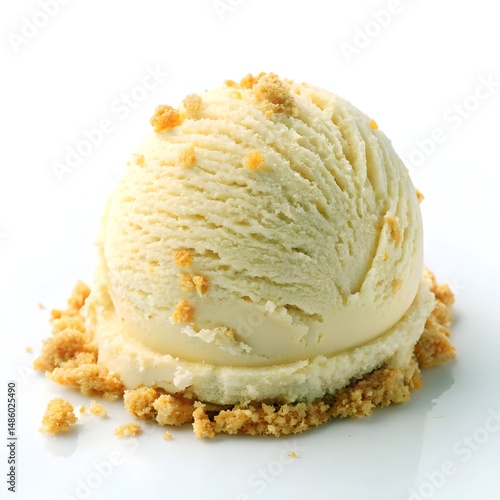 Creamy vanilla bean ice cream scoop, delicately adorned with crunchy cookie crumbles. A close-up studio shot isolated on a pristine white background, showcasing its smooth texture and delightful topp