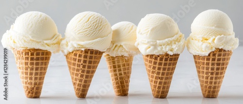 Creamy Vanilla Ice Cream in Waffle Cones on a Light Background