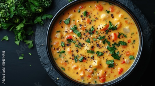 Creamy vegetable soup in a black bowl garnished with fresh herbs, surrounded by broccoli and parsley