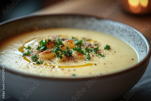 Creamy Vegetable Soup with Fresh Parsley in Elegant White Bowl