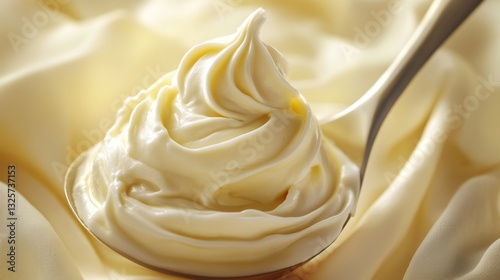 Creamy Whipped Topping in Silver Spoon on Soft Fabric Background