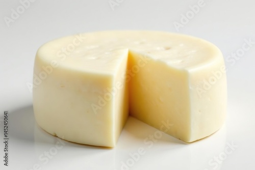 Creamy white cheese wheel on white background, kraft, texture, gouda