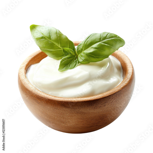 Creamy white yogurt in a wooden bowl, garnished with fresh green basil leaves on a transparent background Concept of healthy eating, dairy, and natural food