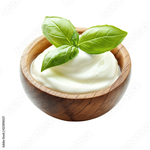 Creamy white yogurt in a wooden bowl with fresh green basil leaves on top, isolated on a transparent background Concept of healthy eating, fresh ingredients, and natural food