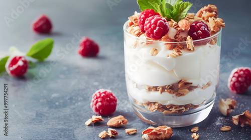 Creamy white yogurt with fresh berries raspberry blueberry blackberry almond pecan granola nuts and mint for delightful healthy snack breakfast protein daily natural wholesome gourmet food glass bowl