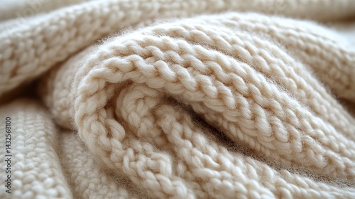 Creamy wool blanket with intricate knit pattern, softly folded i