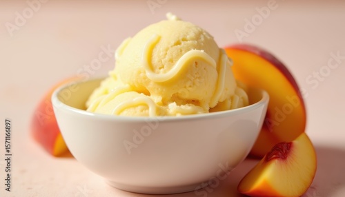 Creamy Yellow Peach Ice Cream in White Bowl with Fresh Peach Slices on Pink Background