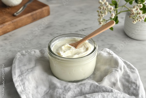 Creamy yogurt in a glass jar on a light marble surface
