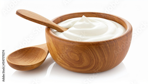 Creamy Yogurt in Wooden Bowl with Wooden Spoon on White Background for Healthy Food Concept