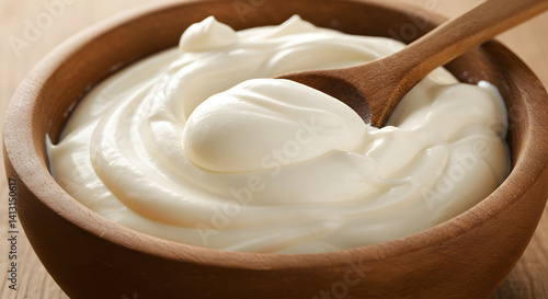Creamy Yogurt With Wooden Spoon Displayed in Rustic Bowl Close Up