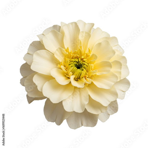 Creamy zinnia flower with yellow center, detailed petals, and soft lighting isolated on white background