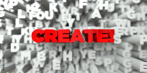 CREATE! - Red text on typography background - 3D rendered royalty free stock image. This image can be used for an online website banner ad or a print postcard.