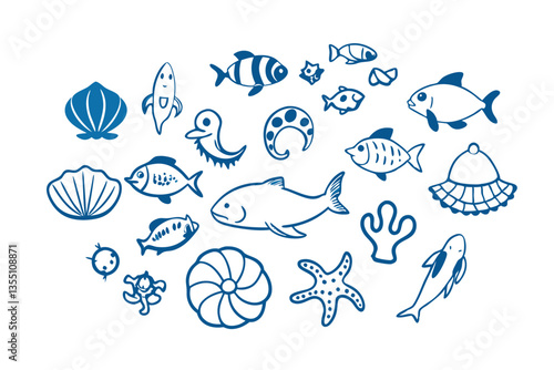 Create a clean, minimalist line icon set featuring diverse sea creatures. Include various fish, crustaceans, and marine mammals. Aim for a consistent style.