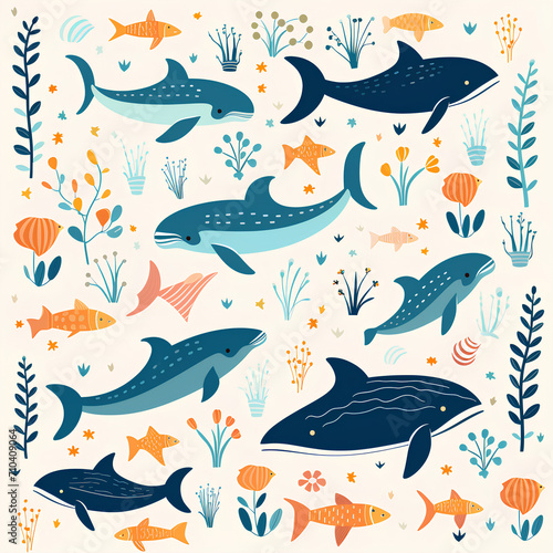 Create a pattern featuring adorable, stylized animals like whale in playful poses, PNG, 300 DPI