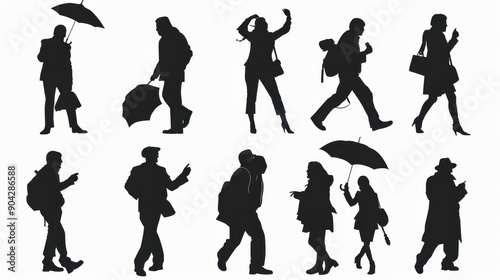 Create a series of black silhouette illustrations showing people in different poses, including thinking, talking on the phone, pointing, holding an umbrella, and celebrating, set against a bright