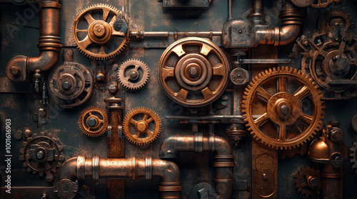 "Create a steampunk-inspired scene with ornate brass and copper gears, steam pipes, and mechanical components, evoking a vintage industrial aesthetic."