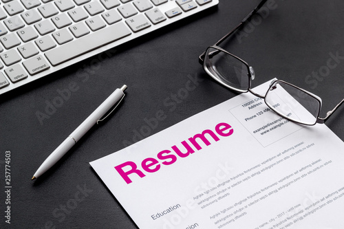Create CV concept with pen, glasses, keyboard on black desk top view