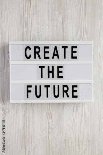 'Create the future' word on modern board on a white wooden background, top view. From above, flat lay, overhead.