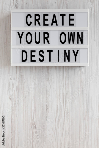 'Create your own destiny' words on a modern board on a white wooden background, top view. Overhead, from above, flat lay. Copy space.