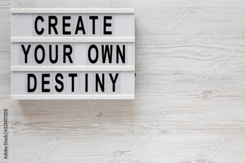 'Create your own destiny' words on a modern board on a white wooden background, top view. Overhead, from above, flat lay. Space for text.