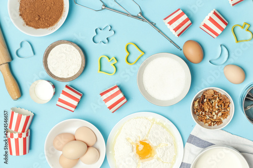 Creating a recipe, Top view of the basic baking ingredients and kitchen utensils on the blue table, cooking concept
