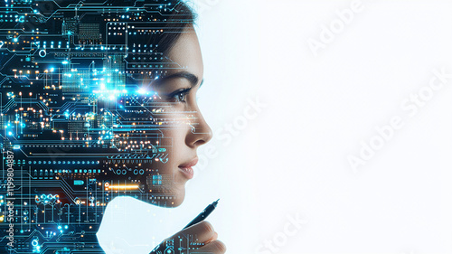 Creating an Innovative Motherboard, double exposure design showcasing woman with digital elements, symbolizing technology and innovation