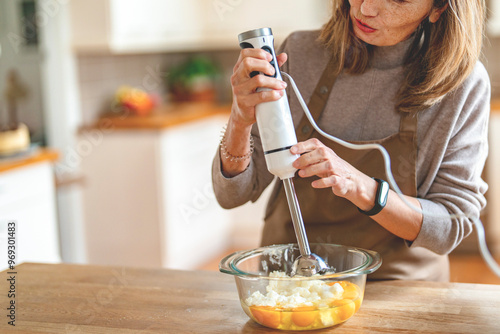 Creating Delicious Recipe With Handheld Blender in Cozy Kitchen During Sunny Afternoon