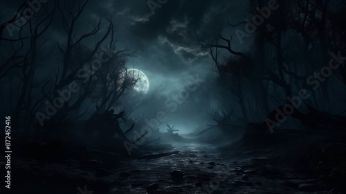ฺCreation. Genesis 1 – 2:4. Background of the black night sky, the full moon bathed the landscape in moonlight, creating a fantasy scene where stars twinkled in a display of natural astronomy.