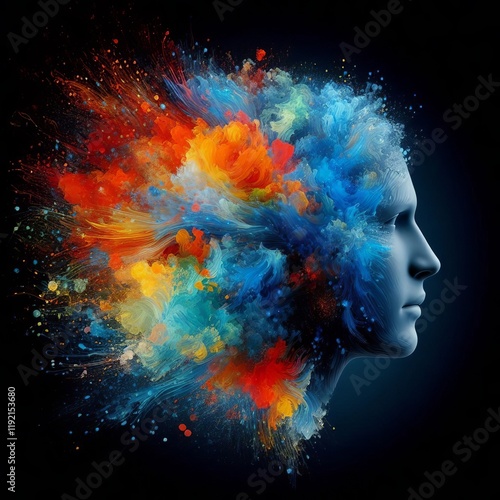 Creative abstract of a woman’s head in paint splatter style promotes mindfulness. Generative AI