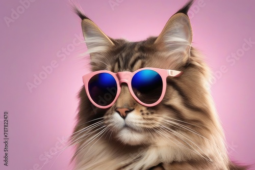 Creative animal concept. Maine Coon cat kitten kitty in sunglass shade glasses isolated on solid pastel background, commercial, editorial advertisement, surreal surrealism