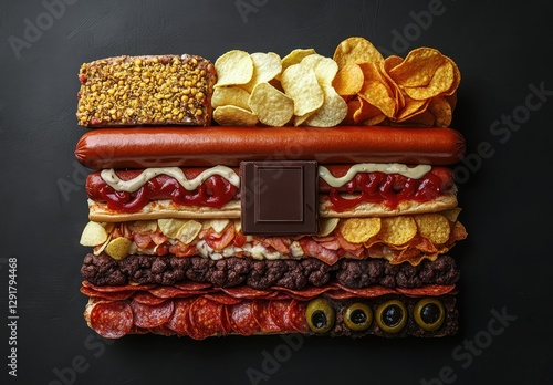 Creative Arrangement of Snack Foods Featuring Hot Dog, Chips, Chocolate Bar, Pepperoni, Pretzels, and Variety of Toppings and Garnishes