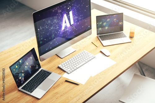 Creative artificial Intelligence symbol concept on modern laptop screen. 3D Rendering