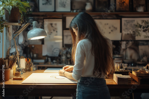 Creative artist works on detailed sketch at cozy studio during evening hours. Generative AI