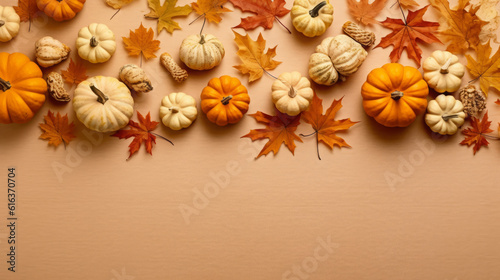 Creative autumn pattern with leaves and pumpkins on a beige background. Minimal Thanksgiving concept. Flat lay