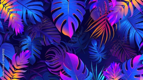Creative backdrop with fluorescent exotic leaves pattern, evoking jungle fauna, Ai Generated.