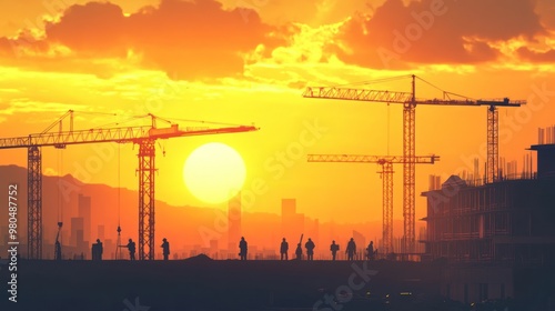 Creative background featuring a construction site with cranes and workers silhouetted against a sunset