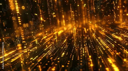 Creative background of imaginative visualization of AI technology in neon gold, with a digital backdrop filled with glowing AI code and data streams.