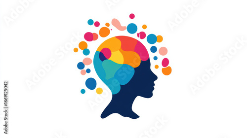 Creative brainstorming icon featuring colorful abstract representation of human head with vibrant bubbles symbolizing ideas and thoughts. This design evokes inspiration and innovation