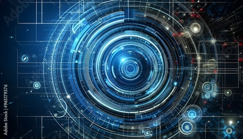 Creative bright blue tech wallpaper with linear circle. Innovation and technology concept. 3D Rendering.