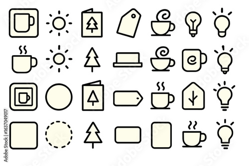 Creative coffee-themed doodles featuring cups, trees, light bulbs, and tags in a minimalist style