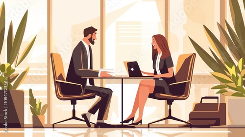 Creative Collaboration: A Middle-Aged Professional Couple Designing Digital Marketing Materials for Business Growth in a Stylish, Modern Office Space with a Touch of Nature