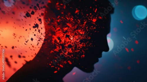 Creative Concept: Abstract Silhouette Shattering into Red Fragments Against Colorful Background