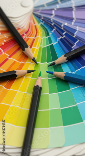 Creative concept with colorful pencils arranged on a vibrant color palette wheel isolated on transparent background